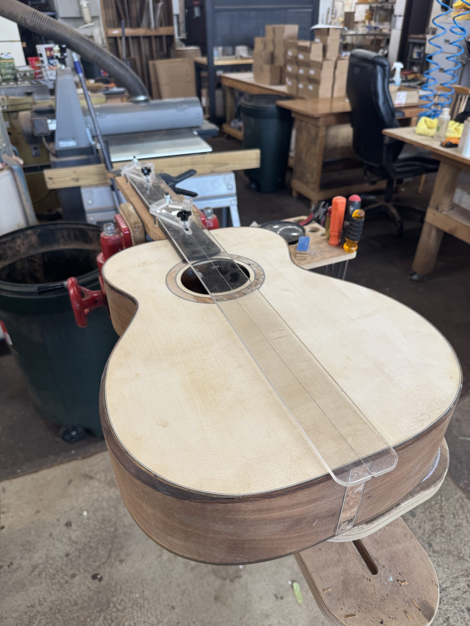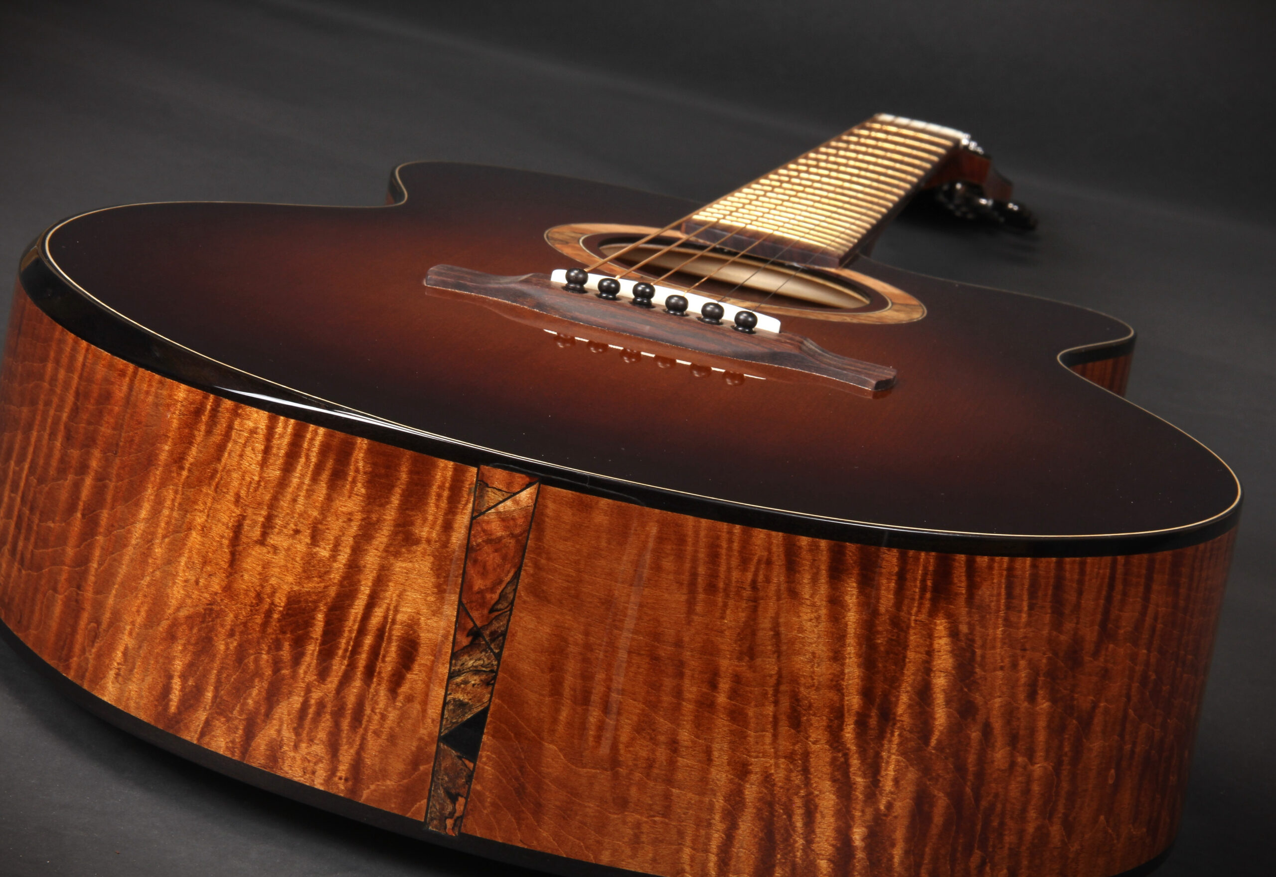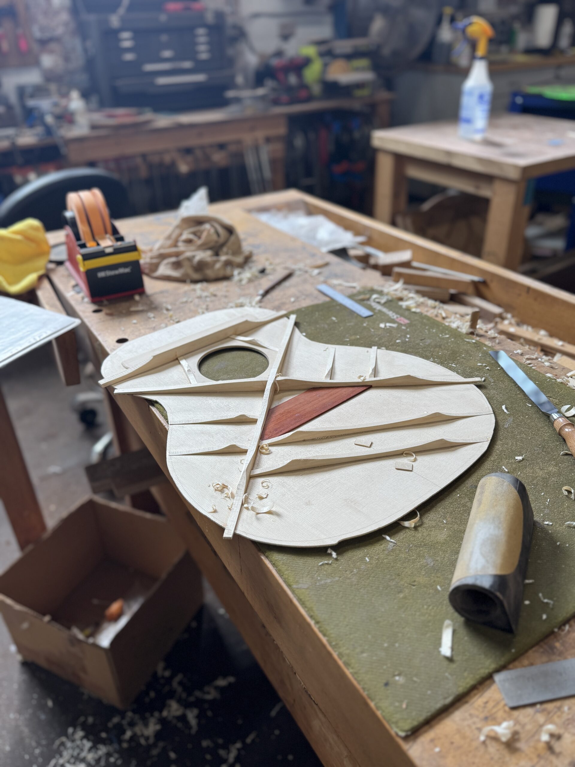 #78 is a client build that’s scheduled to be completed this Spring. I’ve had the maple for around 25 years here in the shop. Completion date is approximately 6/2025. This is a Small Jumbo, long scale that will be voiced for a rich, warm sound. Per client specs, it will have a “Matt Thomas” Wedge, sound-port, arm bevel and a sunburst top. The back and sides will be stained to a caramel color. The guitar was delivered to the client in August 2025!