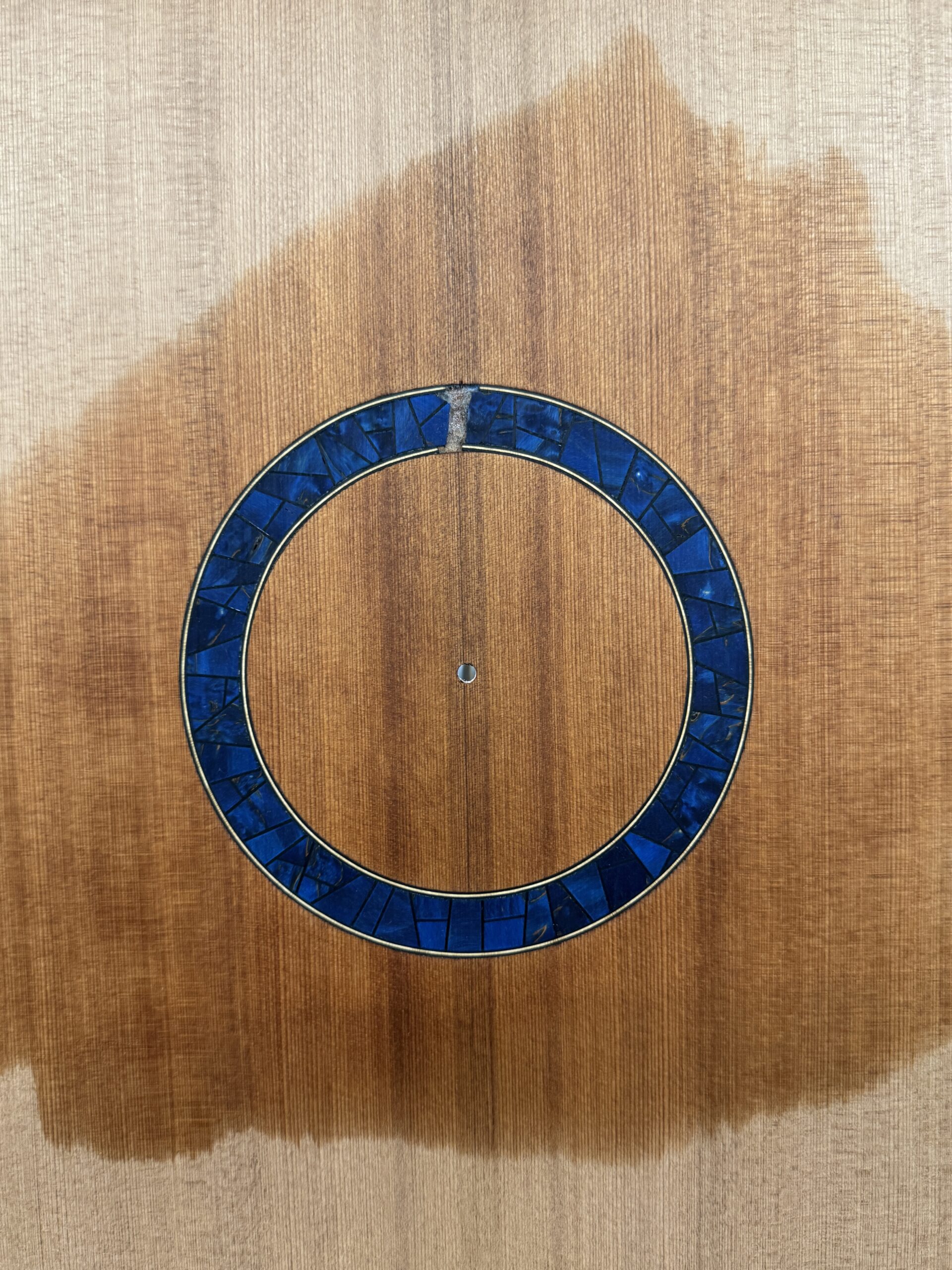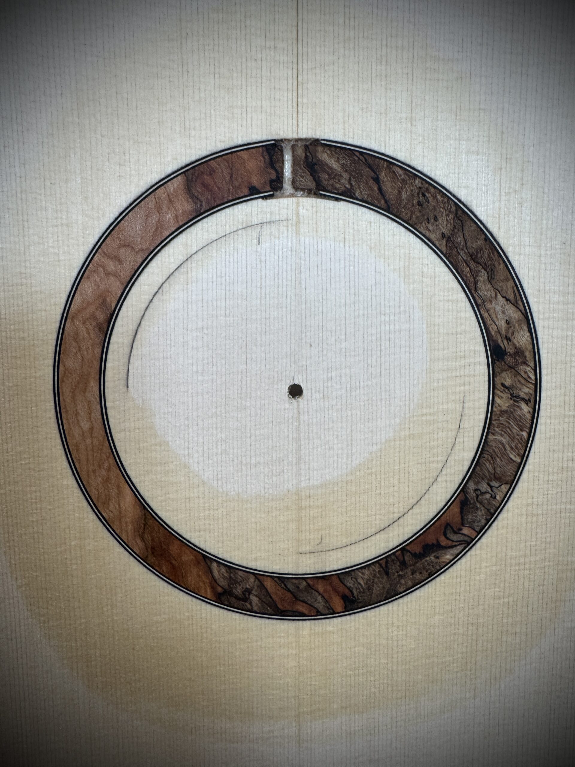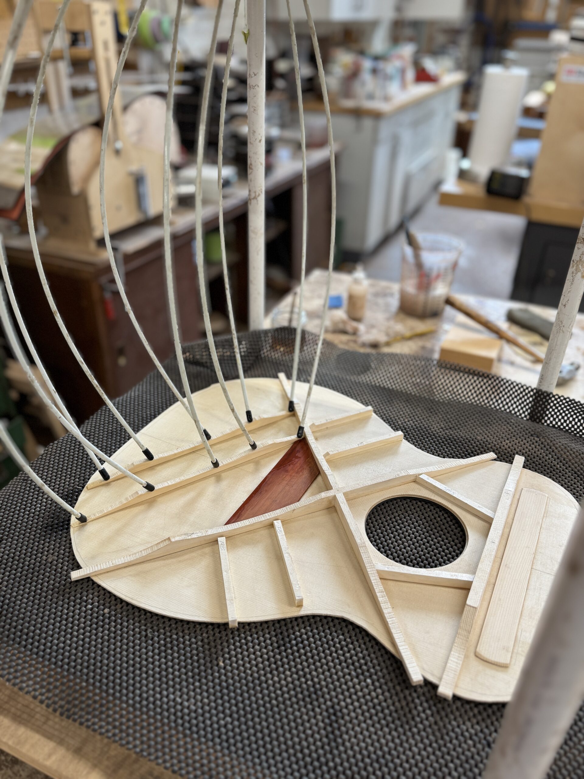 #78 is a client build that’s scheduled to be completed this Spring. I’ve had the maple for around 25 years here in the shop. Completion date is approximately 6/2025. This is a Small Jumbo, long scale that will be voiced for a rich, warm sound. Per client specs, it will have a “Matt Thomas” Wedge, sound-port, arm bevel and a sunburst top. The back and sides will be stained to a caramel color. The guitar was delivered to the client in August 2025!