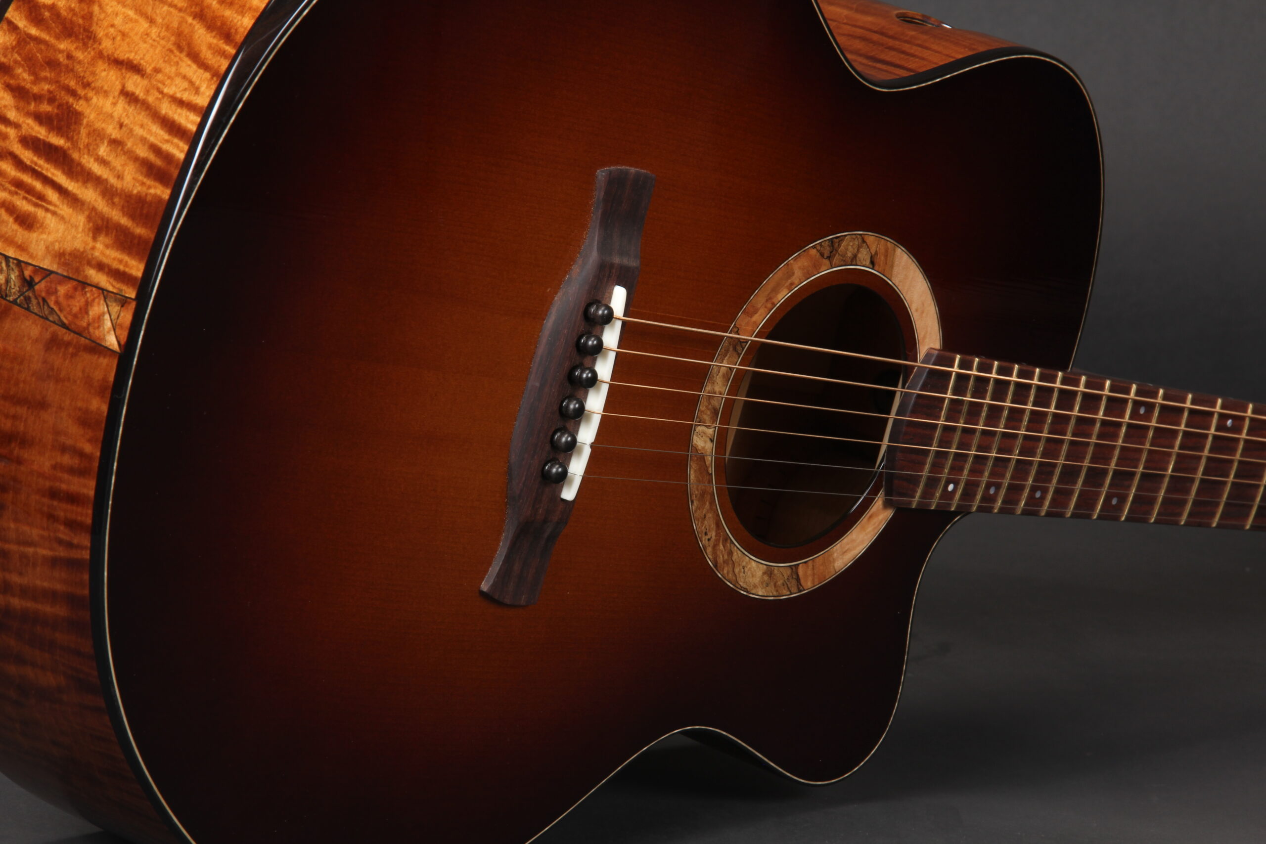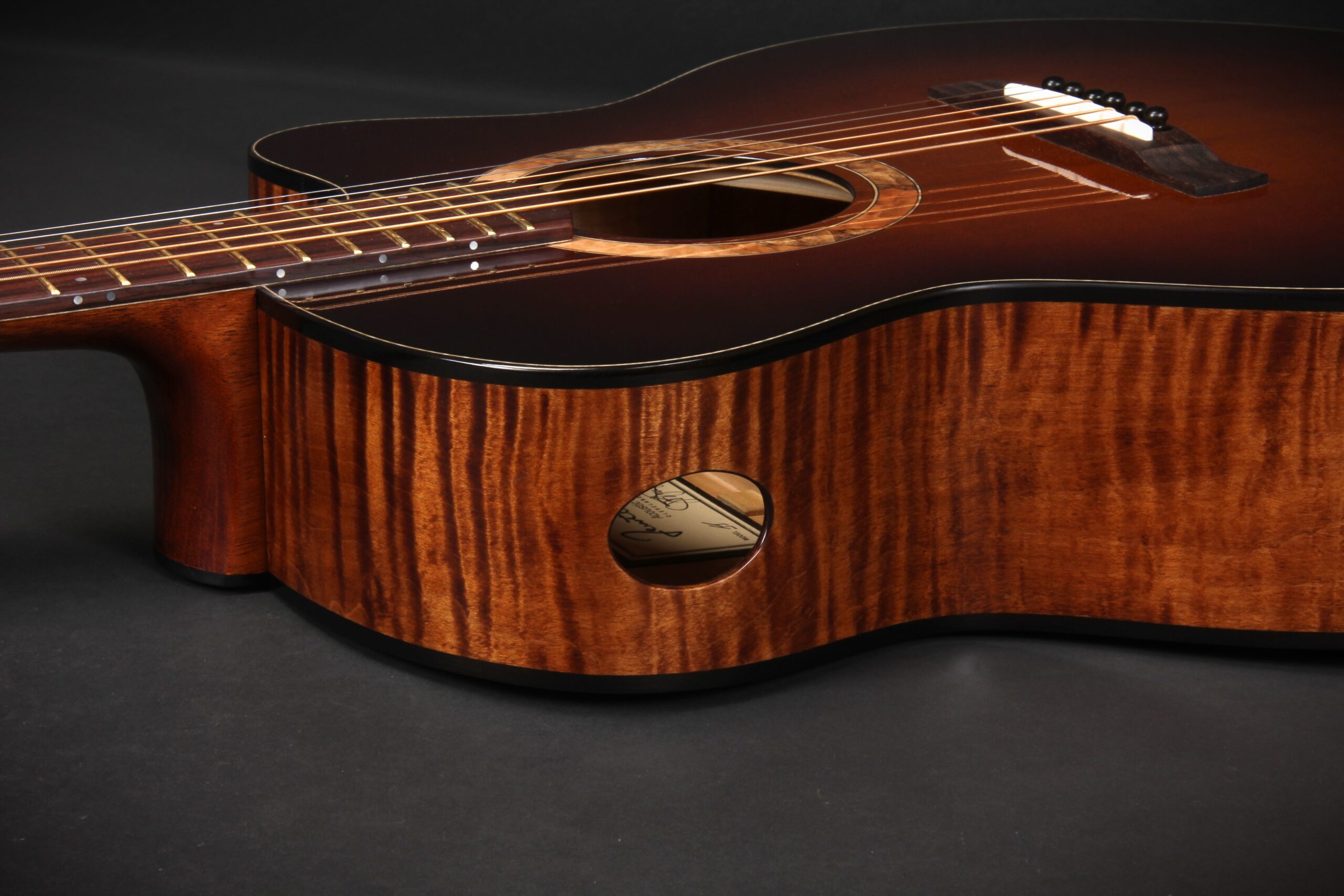 #86 is for a Nashville-based professional guitar player who played a similar Jewitt OM and had to have one. He chose Sinker Mahogany and Swiss spruce but requested a dark vintage-inspired sunburst and a custom 25.25″ scale length. Also features an arm bevel and laminated sides. He plans on touring with this guitar as the band-mate/guitarist/vocals for a very famous country music artist.