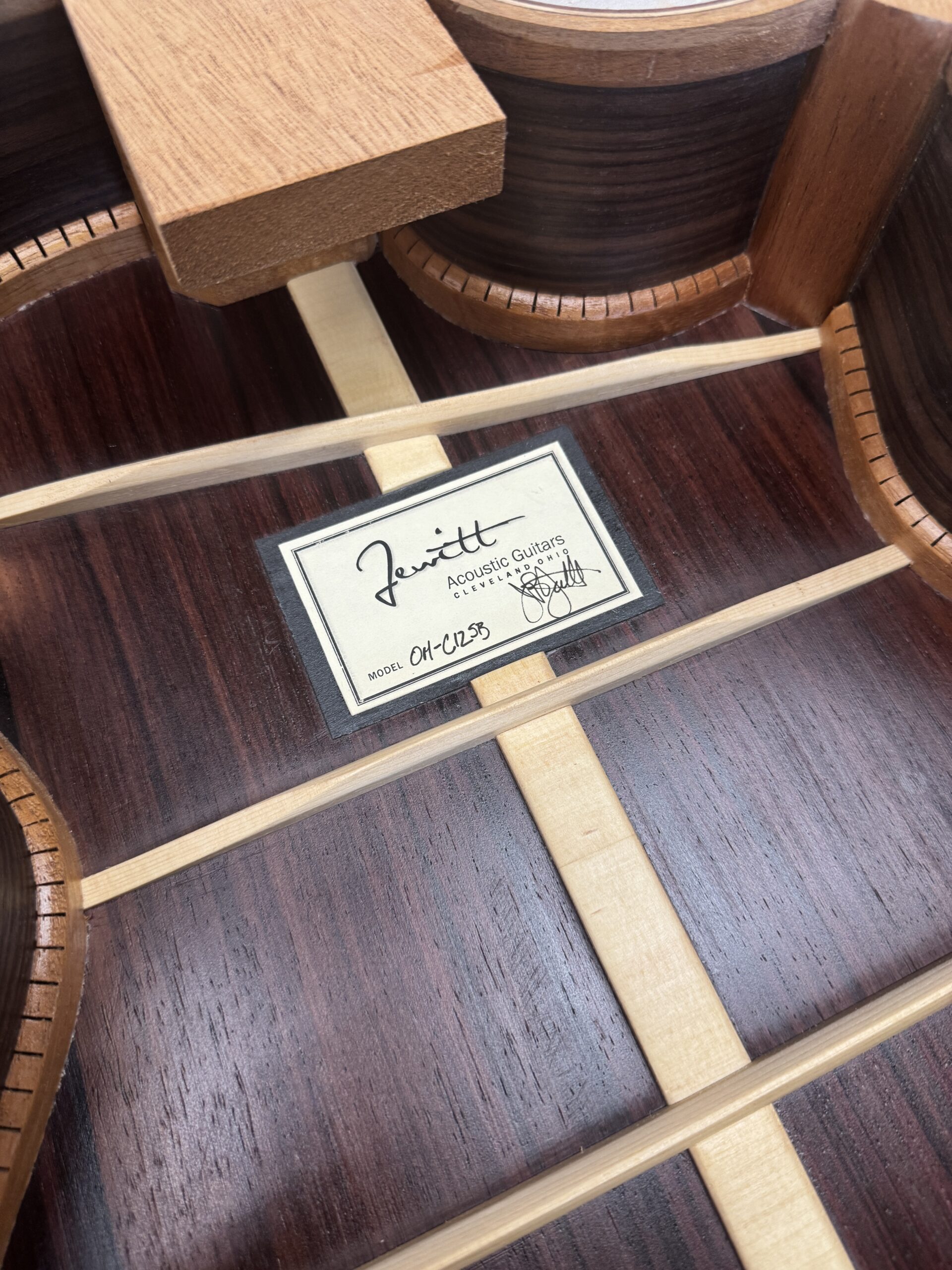 #81 is a guitar that will make its debut at The Artisan Guitar Show in April 2025. Features perfectly quartered and straight grained East Indian Rosewood and a premium Italian Spruce Top with a custom rosette and vintage Jewitt Sunburst. This guitar will be shipped to Eddies Guitars after the show to be demoed by the very talented team of Matt and Jandro. Guitar Sold!