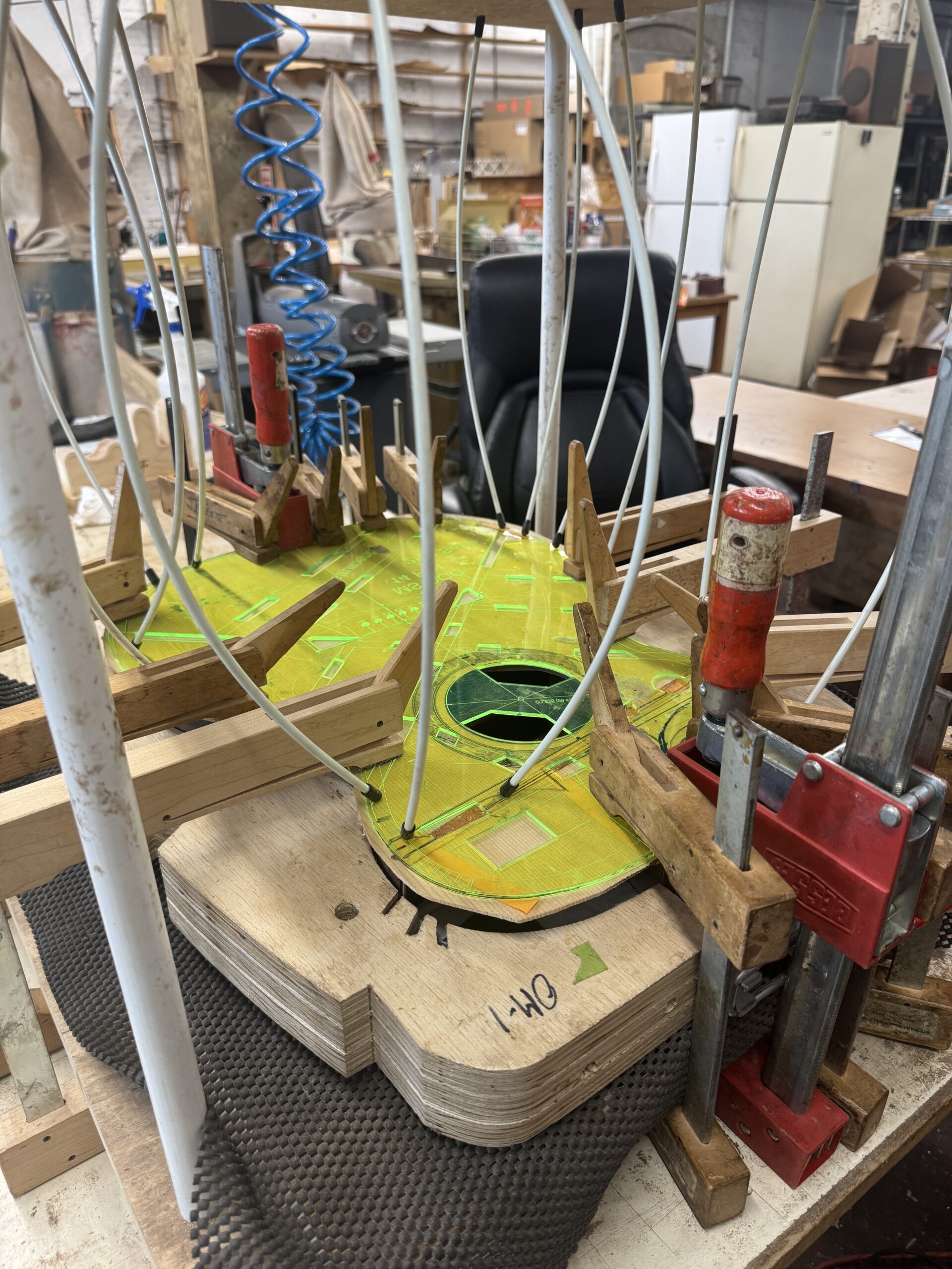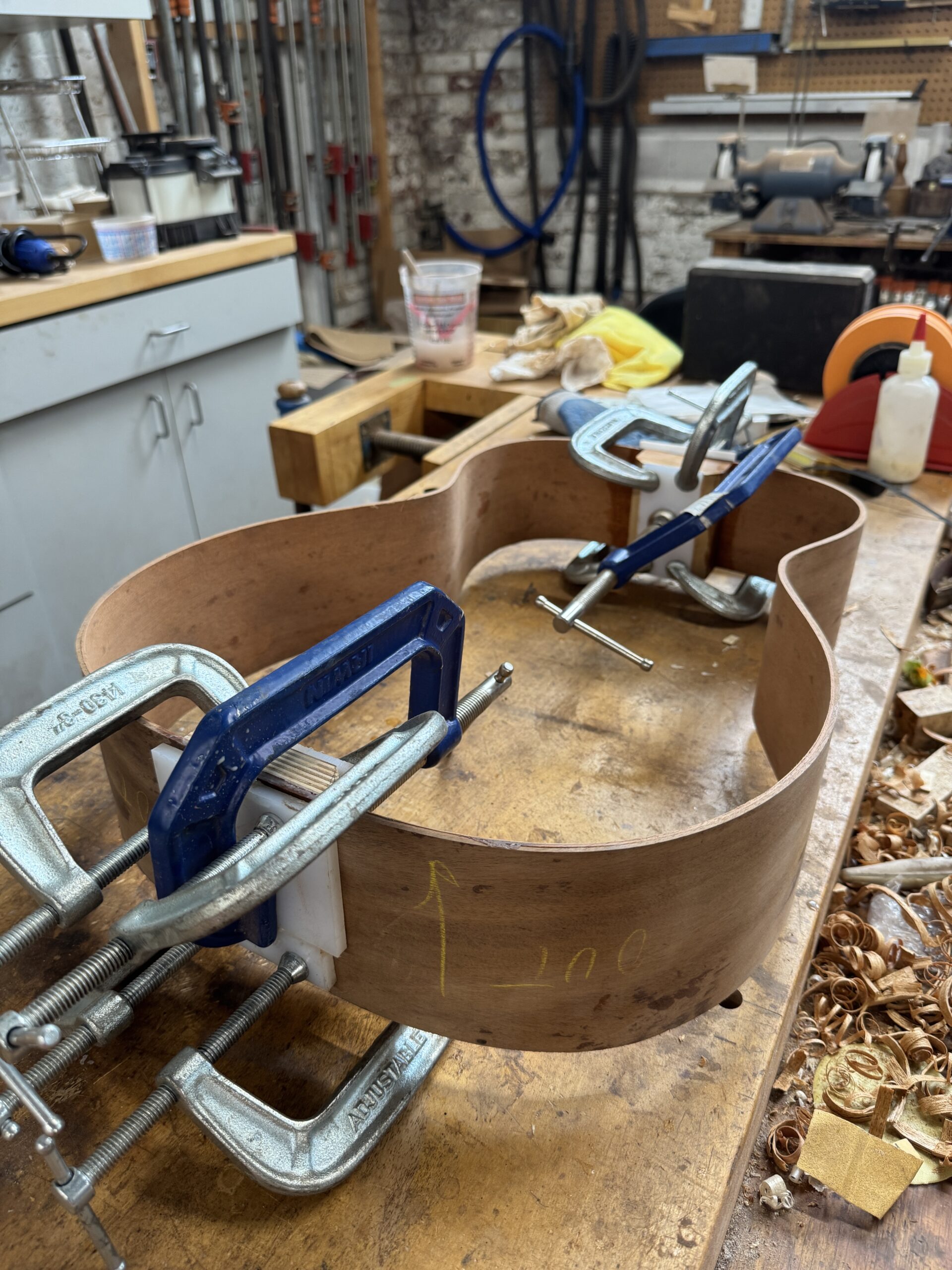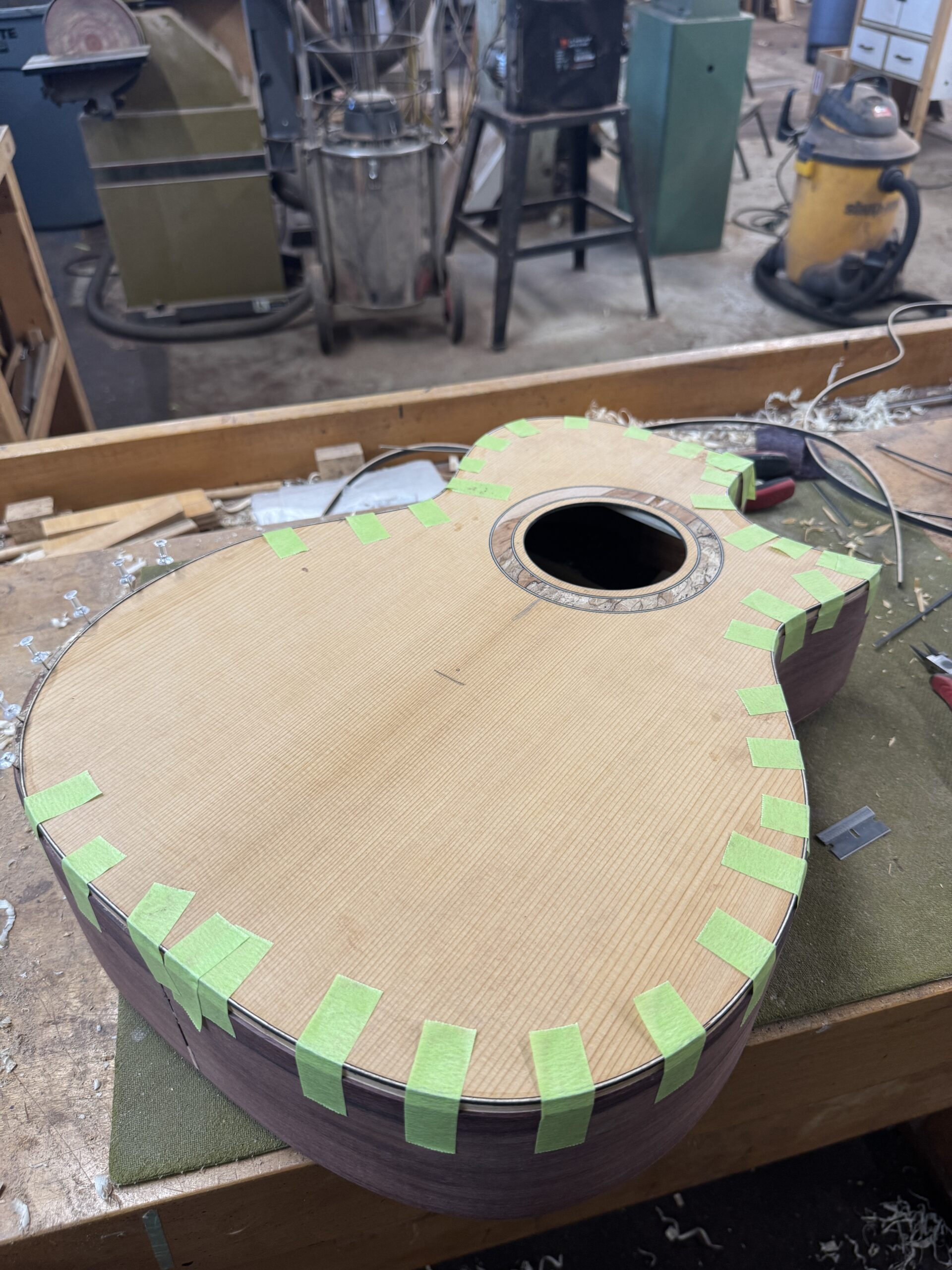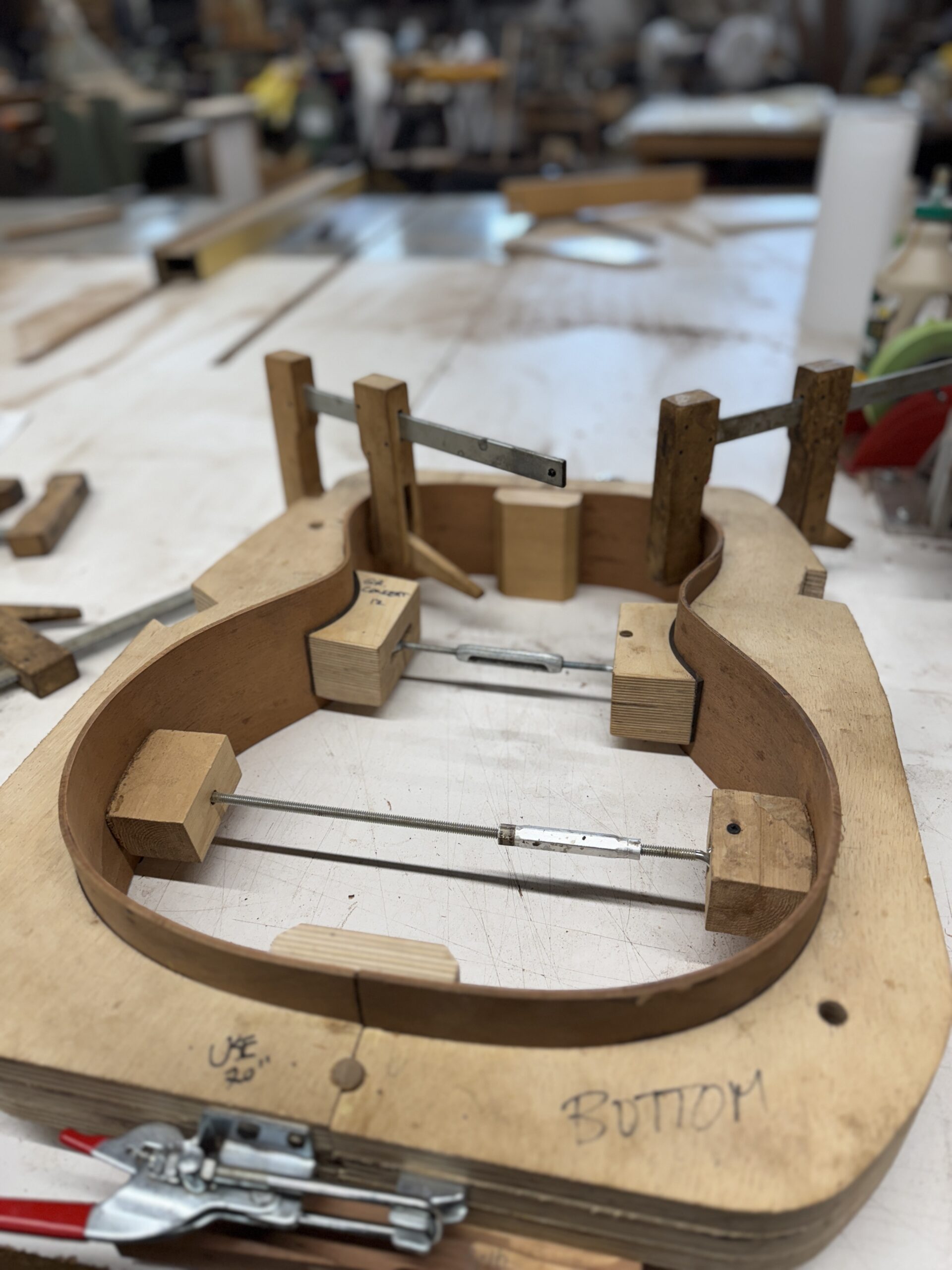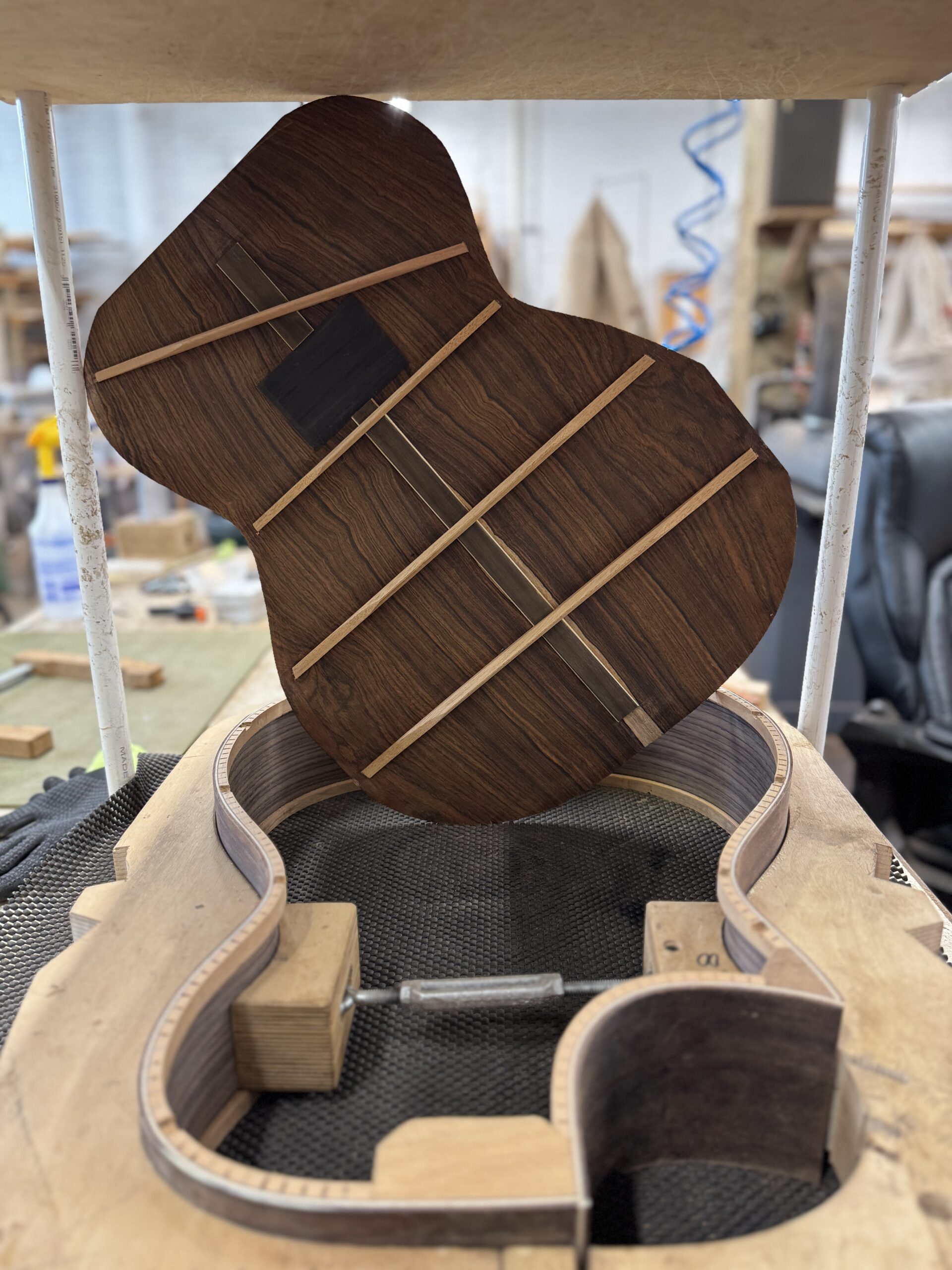 Gluing the top to the back and sides using a go-bar deck and clamps.