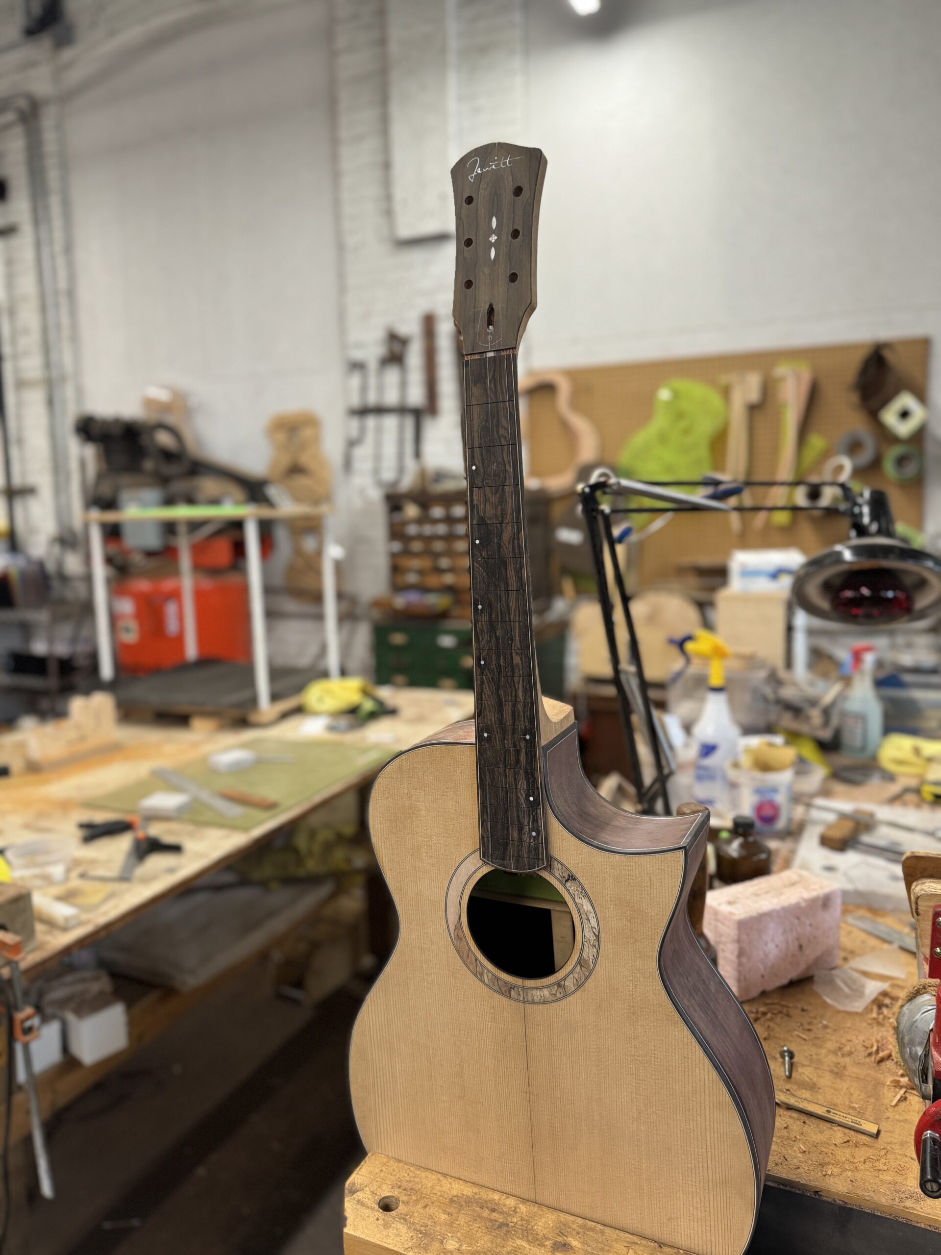 #87 is s JJ Model (Small Jumbo) that’s currently a spec guitar. Classic dark Brazilian with inky spider-webbing and paired with an Italian Spruce top that was purchased years ago and because of its high sonic rating was reserved for this beautiful Brazilian back and sides. If you are interested let me know ASAP as we can discuss options. Triple laminated sides and a Florentine cutaway are the features so far.