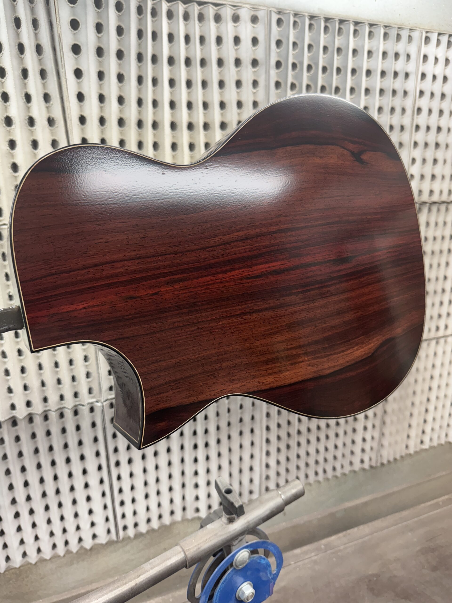 #80 is a spec guitar that will make its debut at The Artisan Guitar Show in April 2025. Features insanely figured Honduran Rosewood and a premium German Spruce top. his guitar will be shipped to Eddies Guitars after the show to be demoed by the very talented team of Matt and Jandro. Guitar Sold!
