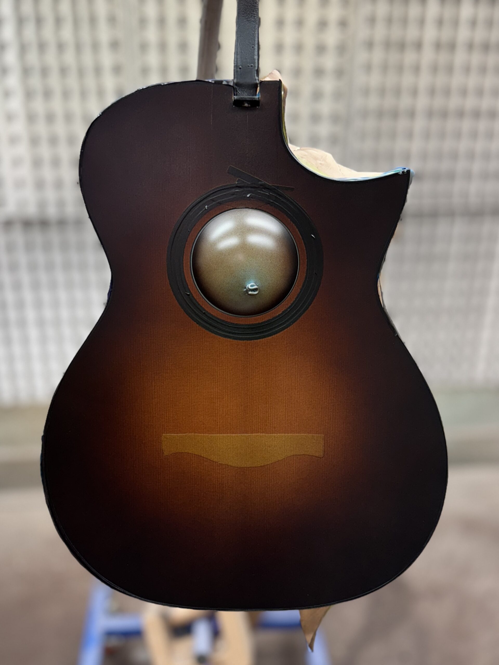 In the spray booth. Sunburst applied and getting ready for the clear coats of urethane.
