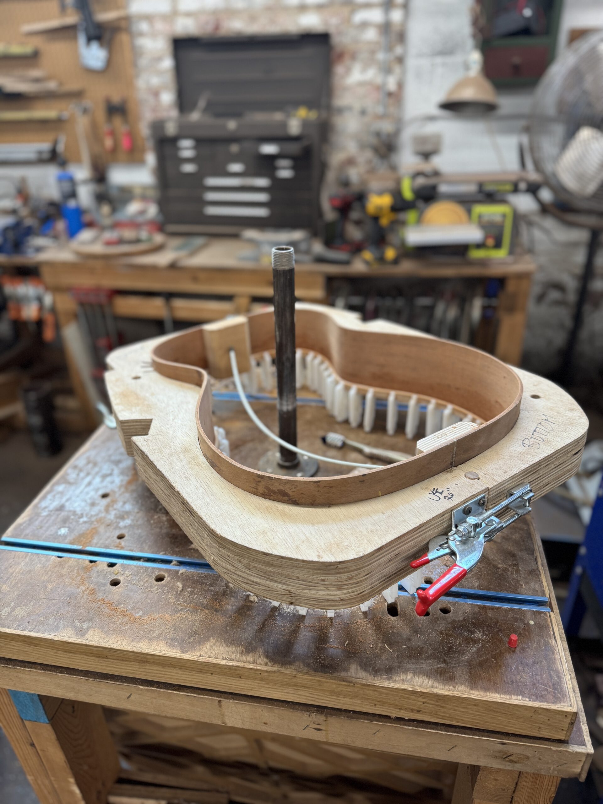 Binding the top. Arm bevel area will get flat sanded and then veneer applied.