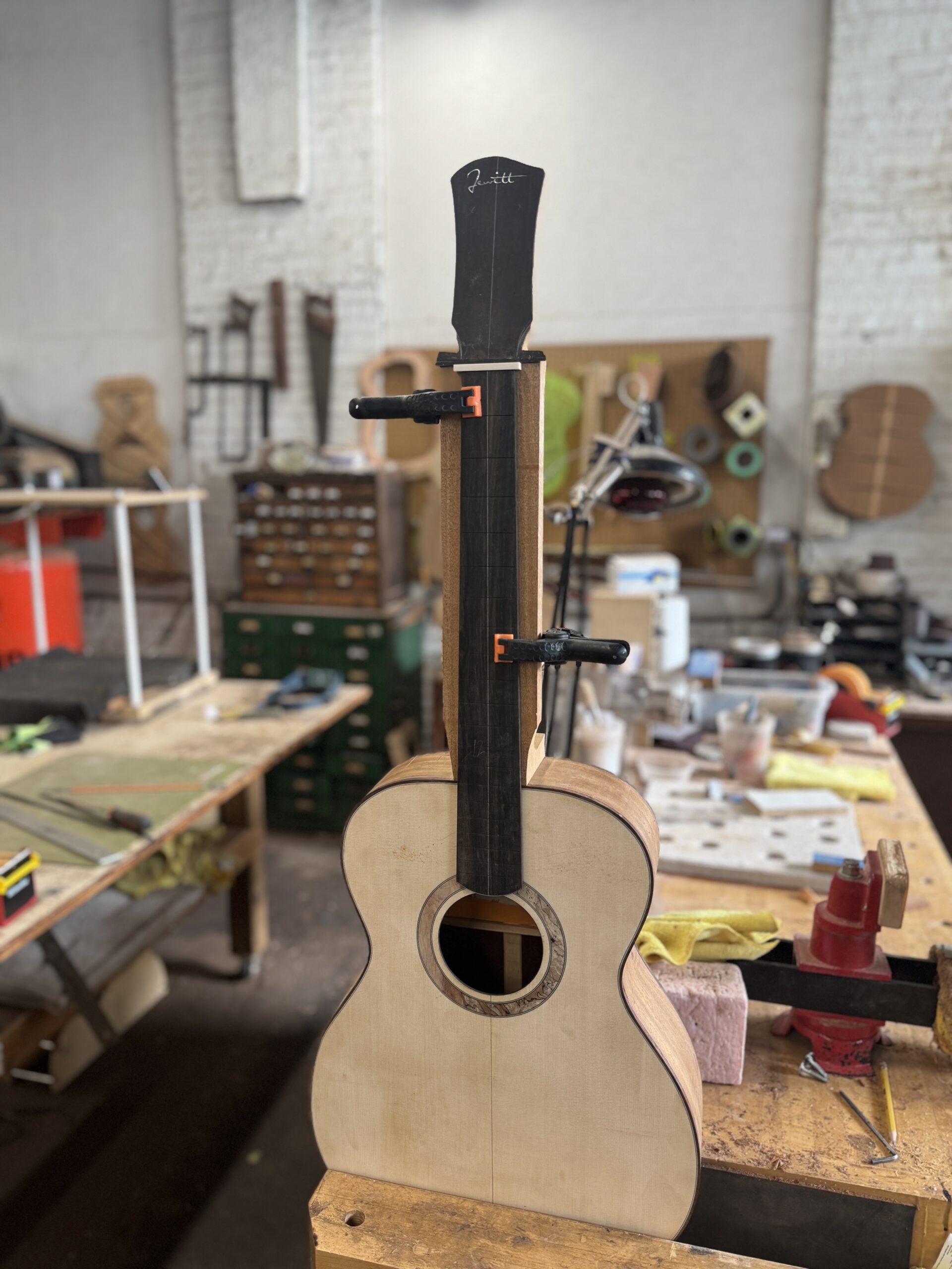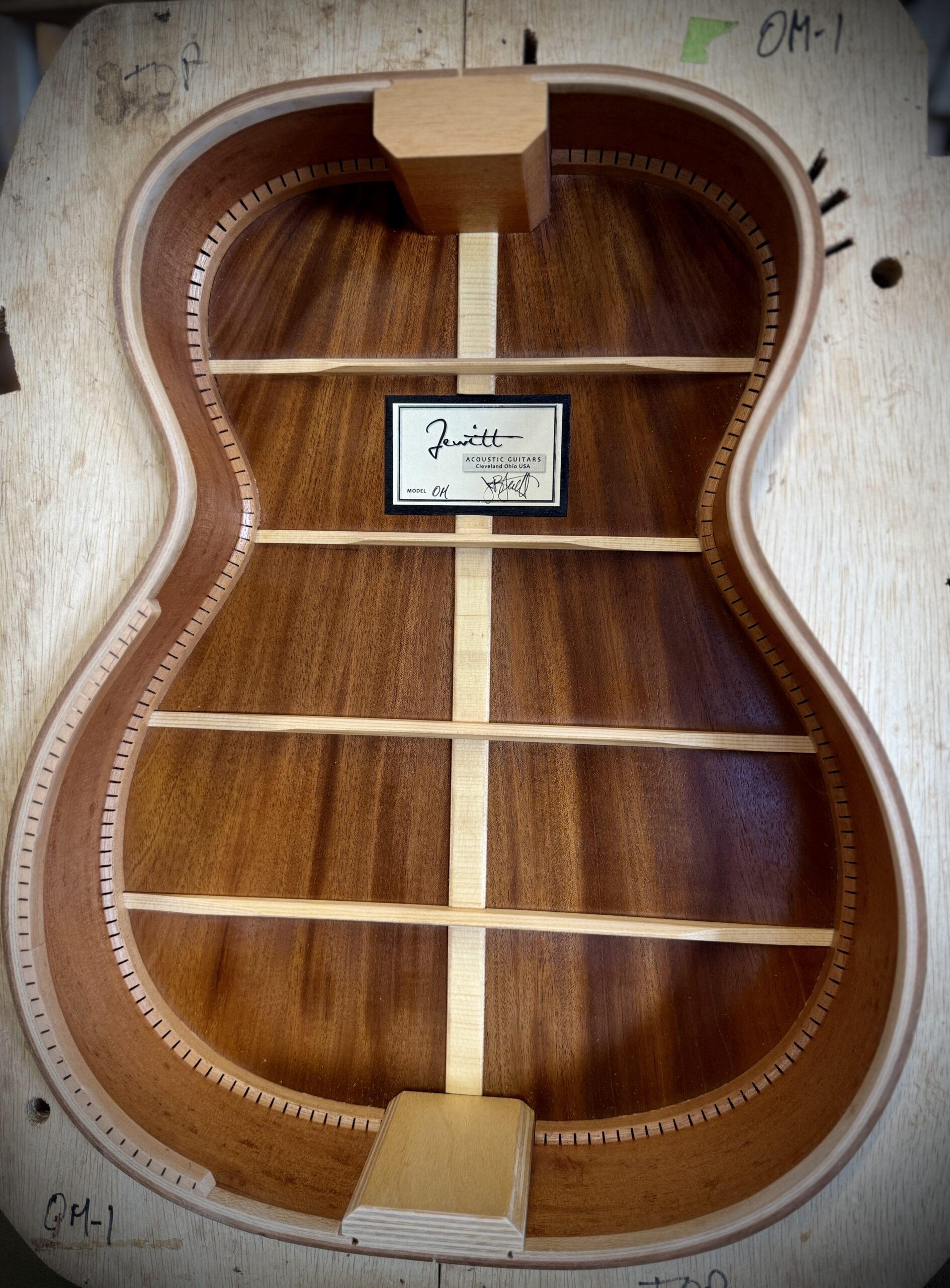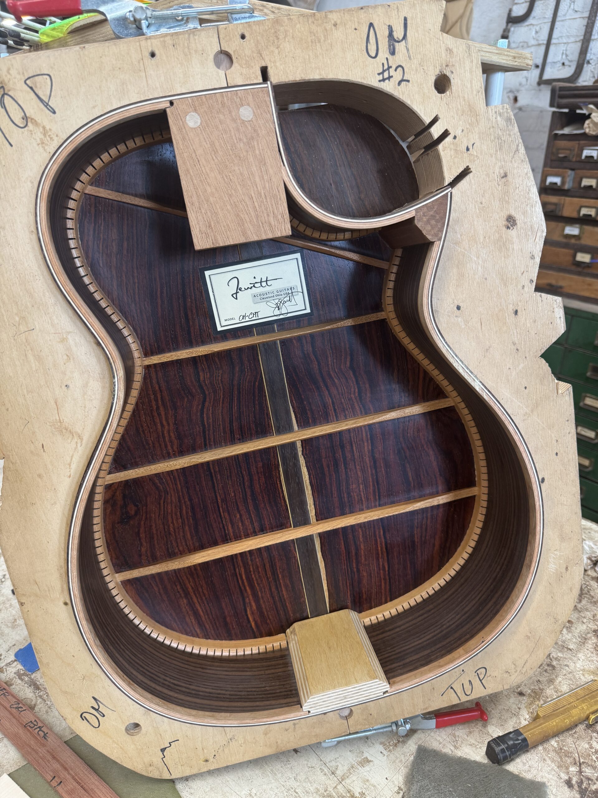 #85 is for a local client and it’s his 3rd Jewitt Guitar. He chose a set of Bois de Rose and a Torrefied ADI top from our inventory, and initially, wanted a Grand Concert 12 fret but changed his mind after seeing and playing the OM-12SB below at The Artisan Guitar Show this past Spring. Completion date is Summer 2025.
