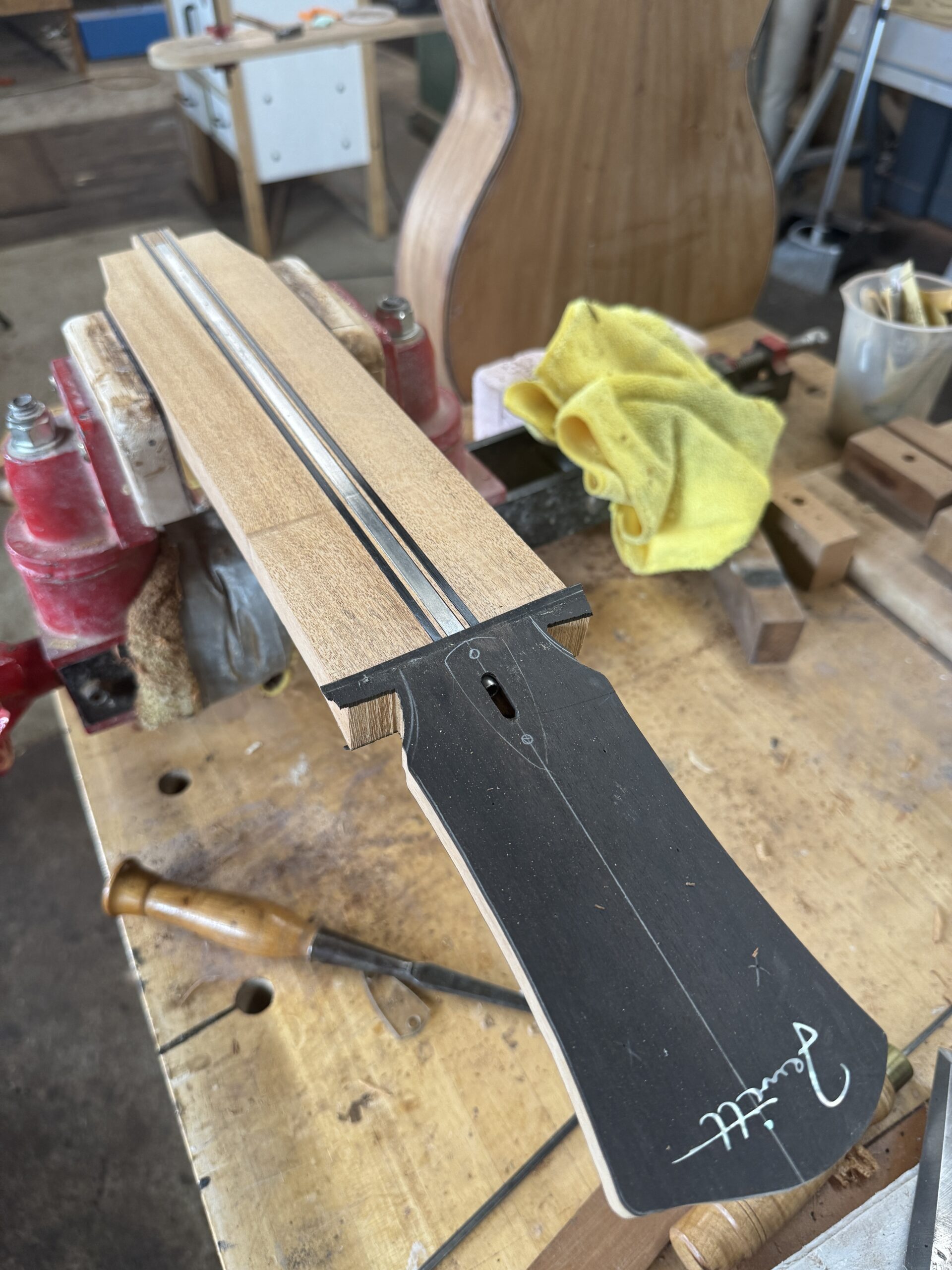 Positioning the Peghead Plate and Fingerboard. These both have white purfling lines so they must be perfect to line up.
